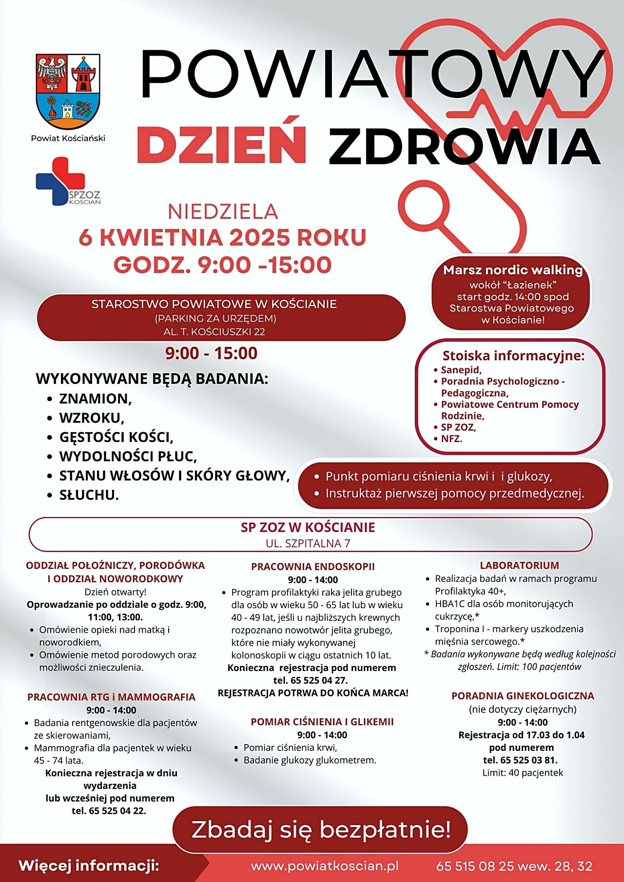 z okazji Światowego Dnia Zdrowia, Powiat Kościański oraz SP ZOZ w Kościanie organizują bezpłatne badania dla mieszkańców powiatu. Wydarzenie odbędzie się 6 kwietnia 2025 roku w dwóch lokalizacjach: na parkingu za Starostwem Powiatowym w Kościanie oraz w budynku szpitala.